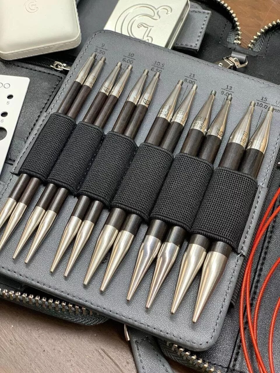 Этот полный комплект включает в себя 14 пар спиц: 8 пар сменных круговых спиц, изготовленных из карбона (углеродного волокна) и нержавеющей стали, а также 6 пар спиц из элегантного африканского черного дерева Blackwood с наконечниками из нержавеющей стали.