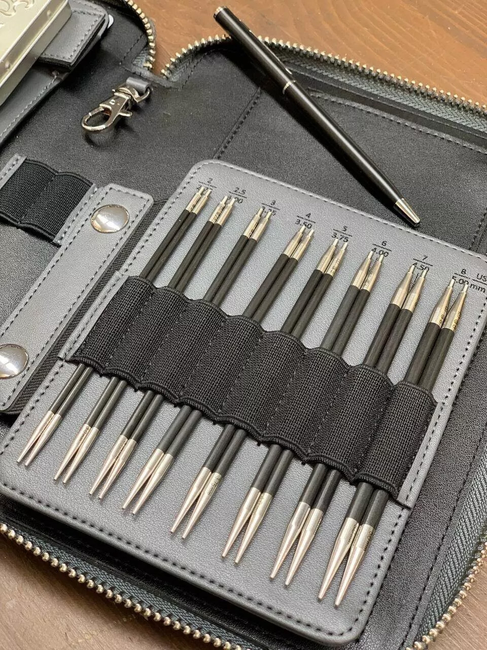 1. 14 пар спиц (длиной 13 см): 2.75, 3, 3.25, 3.5, 3.75, 4, 4.5, 5, 5.5, 6, 6.5, 8, 9, 10 мм. До 5 мм — карбон, с 5,5 мм — черное дерево.